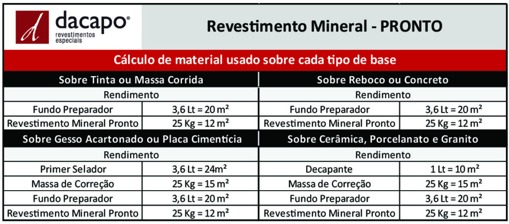 O REVESTIMENTO MINERAL PRONTO DACAPO é um composto mineral à base de emulsão acrílica com adição de agregado mineral selecionado e beneficiado de coprodutos do minério de ferro e de rochas ornamentais.